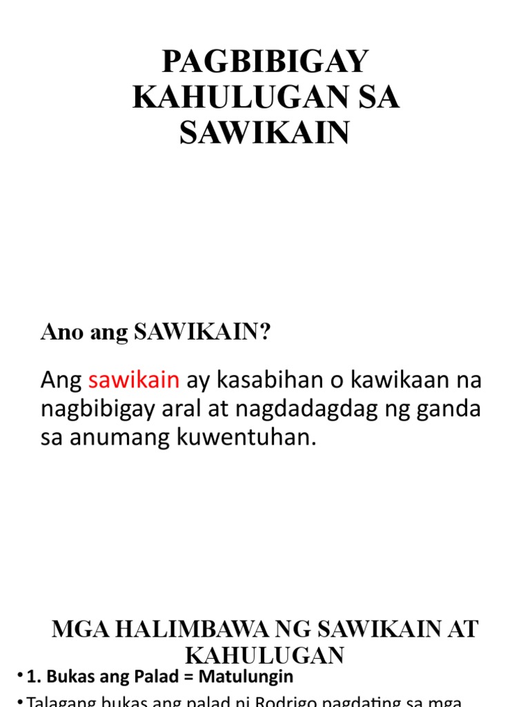 Sawikain Kahulugan at Mga Halimbawa Sawikain o Idyoma Sa araling ito ay ipinapahayag ang kahulugan ng SAWIKAIN o IDYOMA at mga Halimbawa nito. Tamang sagot sa tanong. Salawikain tungkol sa kalikasan.