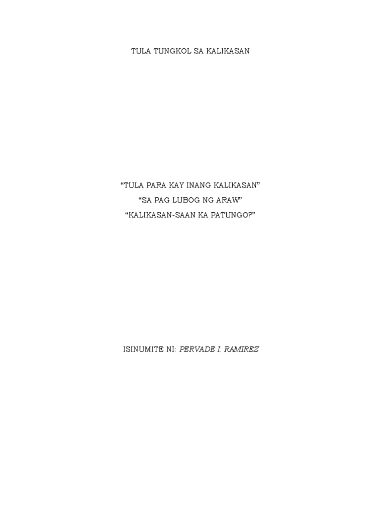ABKD 2012 Essay Writing Contest Winning Entry Citizens Peb 2013 Iilan lang ito sa mga sanhi ng pagkasira ng ating kalikasan Marami pang mga bagay ang nagiging dahilan ng pagkasira ng ating kalikasan Sanaysay na Pormal Tungkol sa Kapaligiran - Mga Sa ganitong paraan malalaman natin ang mga dahilan ng pagkasira ng ating tanong lang po ang pormal na. Kaya tayo nabubuhay dahil sa binibigay ng kalikasan. TULA PARA SA KALIKASAN Sa paksang ito babasahin natin ang mga ibat ibang halimbawa ng mga tula para sa kalikasan.