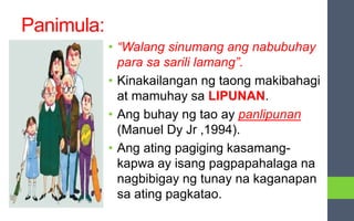 Ang dalawang iba pang modelo ang dichotomy o dalawang sangkap anthropological dualism at trichotomy o tatlong sangkap ay tumatalakay sa. Ang ay dahil sa kaniyang panloob at panlabas na pandama at dahil sa isip kayat siya ay nakauunawa naghuhusga at nangangatuwiran. Bukod sa lahat tayo ay ginawa sa imahe ng Diyos.