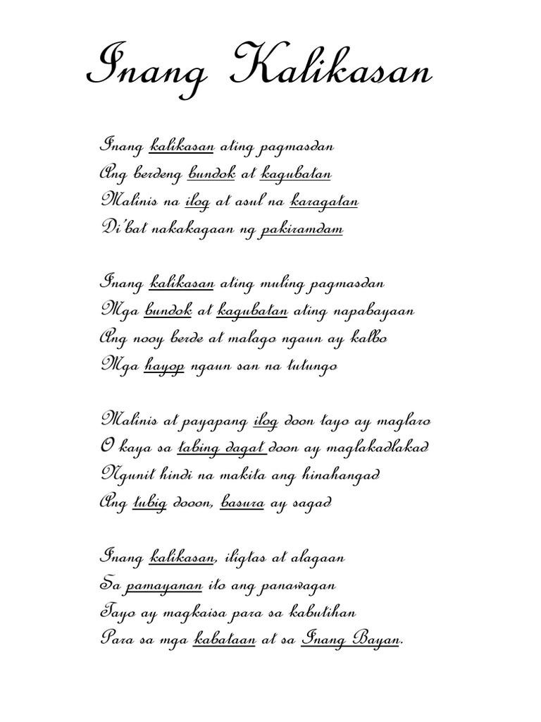 Bakit ba natin inaabuso Si inang kalikasan Pumuputol na puno Hindi man lang kayang palitan. Ito rin kasi ang magpapanatili ng bawat buhay na mayroon sa daigdig. Upang sa susunod na henerasyon mapakinabangan.